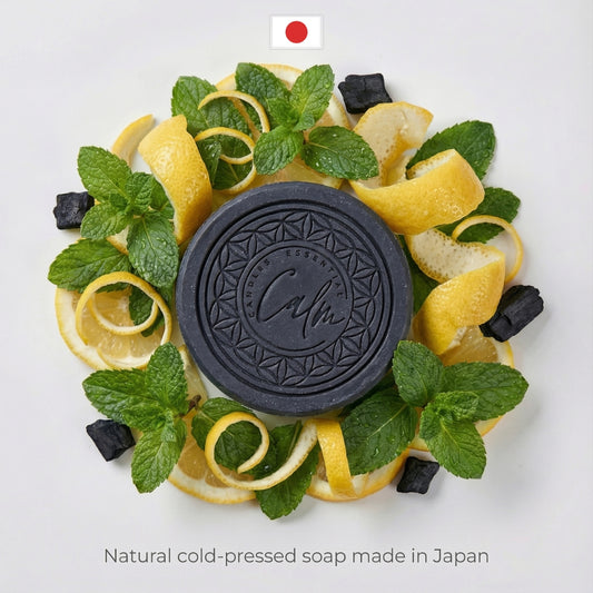 Calm Candles Essential Cold-Pressed Black Charcoal Peppermint Lemon Peel Soap, 150 g, Solid Bar Cleanser, Deep Cleansing & Deodorizing, Refreshing Mint Citrus, Made in Japan
