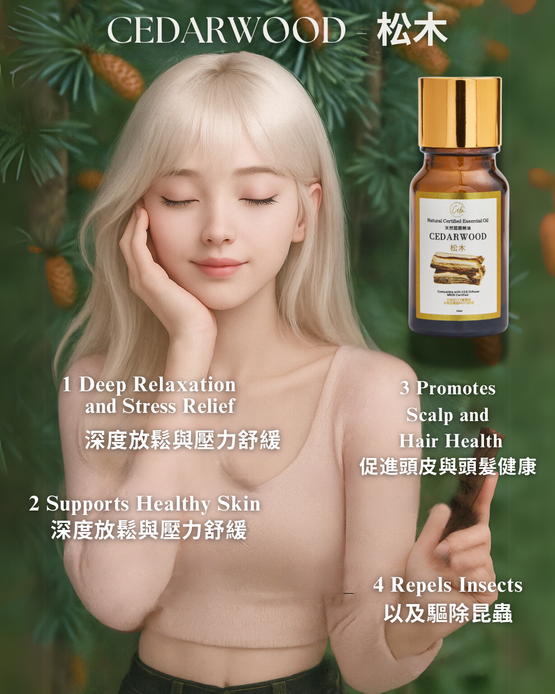 Cedar wood oil is derived from the bark, needles, leaves, and berries of cedar trees. It is known for its warm, woody aroma and a variety of benefits for skin, hair, and overall well-being.