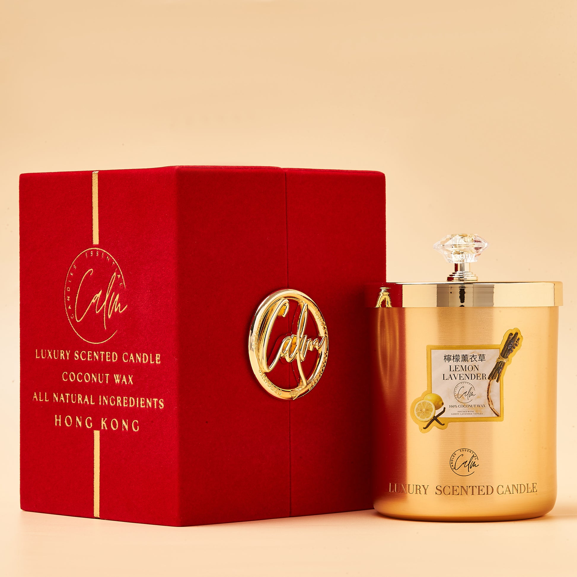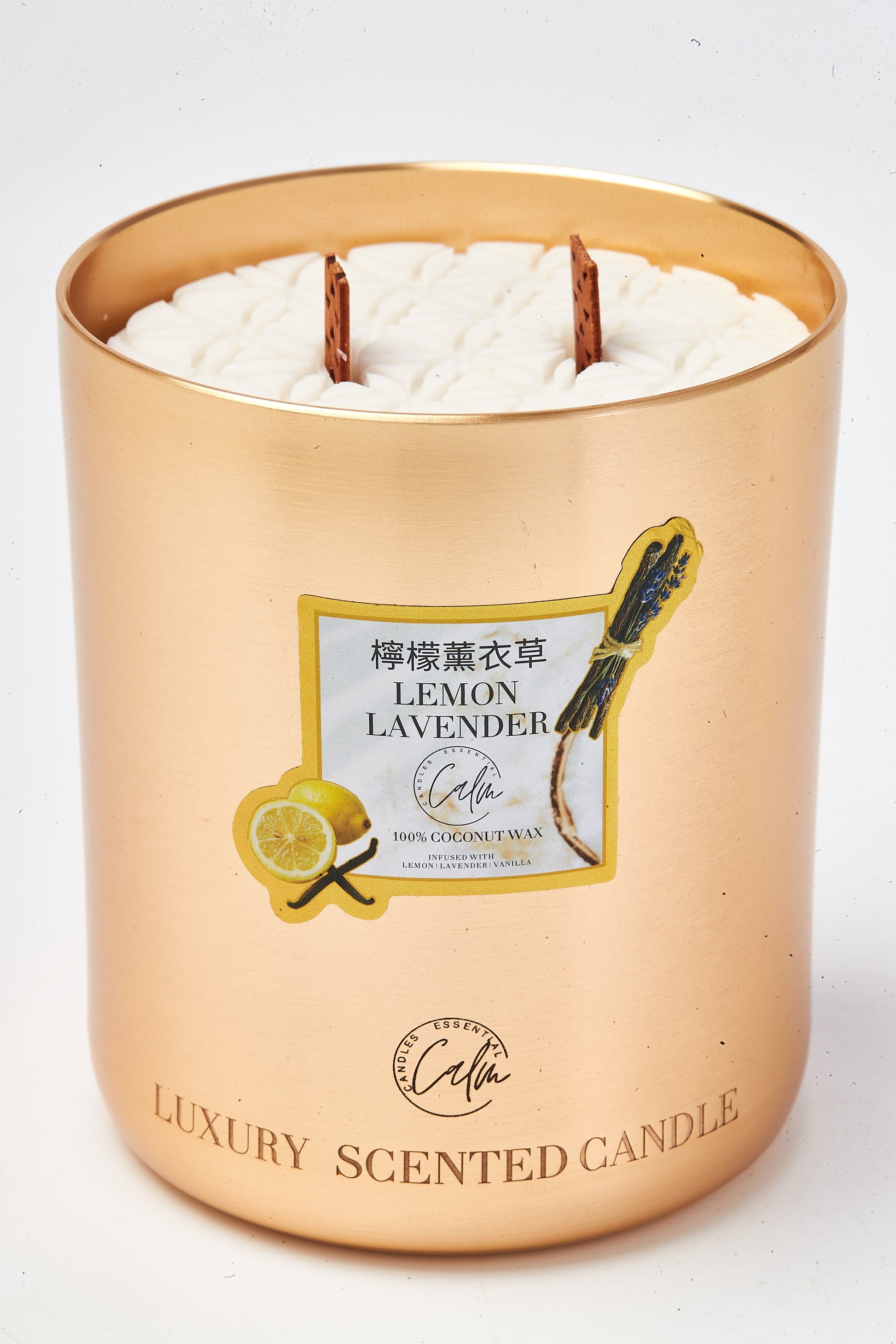 Calm Candles Essential – Lemon & Lavender Metal Gold Velvet Collection | Made with Premium Coconut Wax & Cherry Wooden Wick