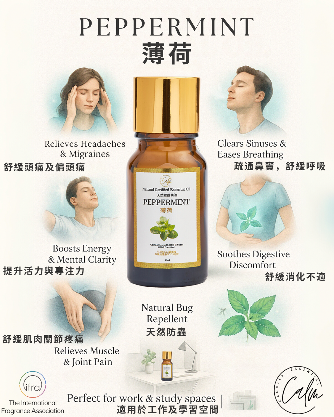 從薄荷植物的葉子和花頂提取,這種精油具有強烈的薄荷香氣。以其清涼和提神的特性而聞名,經常用於緩解頭痛、肌肉疼痛和消化問題。