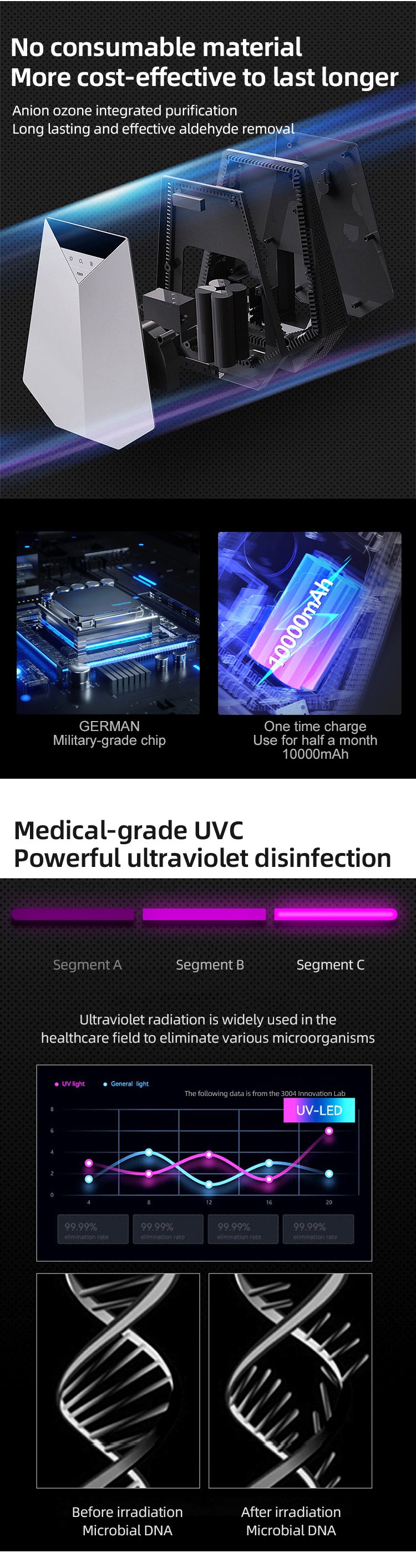 - UVC Sterilization: Eliminates 99.99% of bacteria, viruses, and airborne pathogens. Germicidal UV Lamp Negative ion Ozone Generator