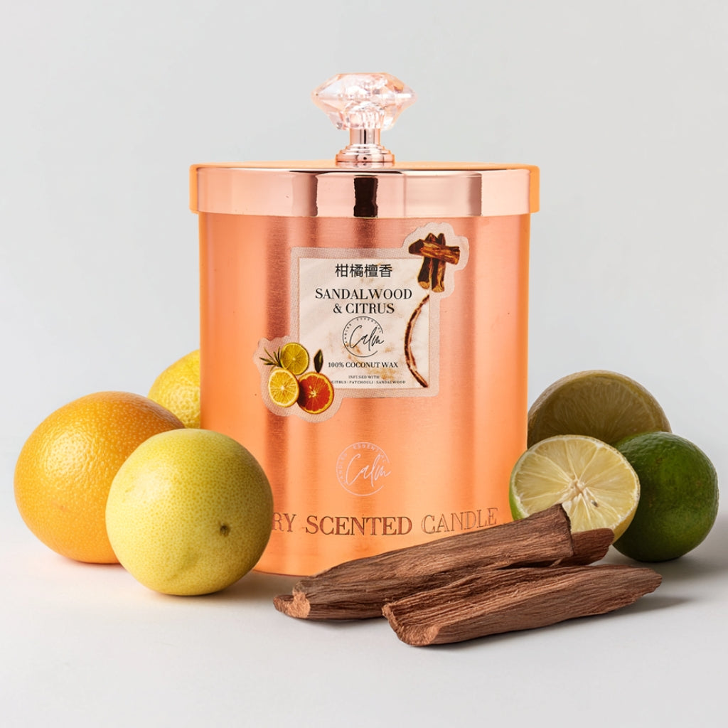 Infused with Sandalwood, Bright Citrus & Patchouli | Coconut Wax | Cherry Wooden Wick | Luxury Metal Jar